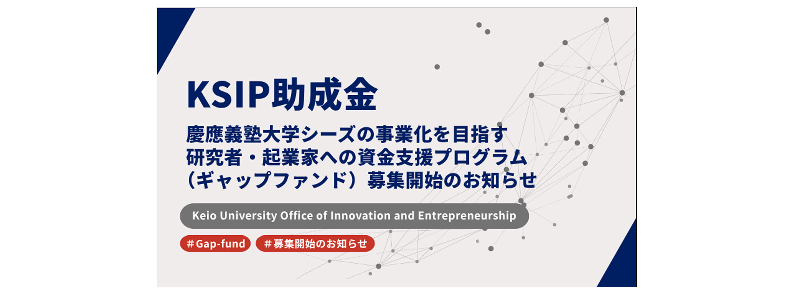 - ニュース 【募集開始】KSIP助成金:慶應義塾大学シーズの事業化を目指す研究者・起業家への資金支援プログラム(ギャップファンド)のお知らせ